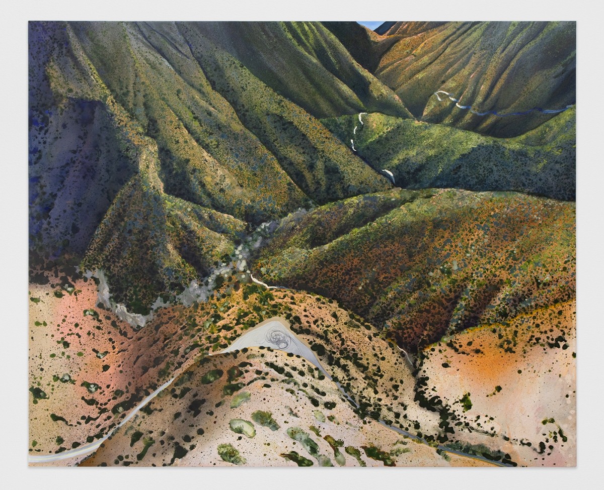 Referencing her own photos and screenshots of aerial images from Google Earth, Hill evinces the outdoor environment through a combination of strategies. Tightly rendered formations in pictorial space are layered in among expressive painterly marks that activate the material surface of the canvas. Like a film set, from a distance the scene coheres, but closer viewing reveals ruptures in the illusion: swaths of sandy medium, spray paint and splatter, fomenting swirls of pigment and mineral spirits, stamped on leaf patterns, and impasto built up to form a consistently disturbed world.