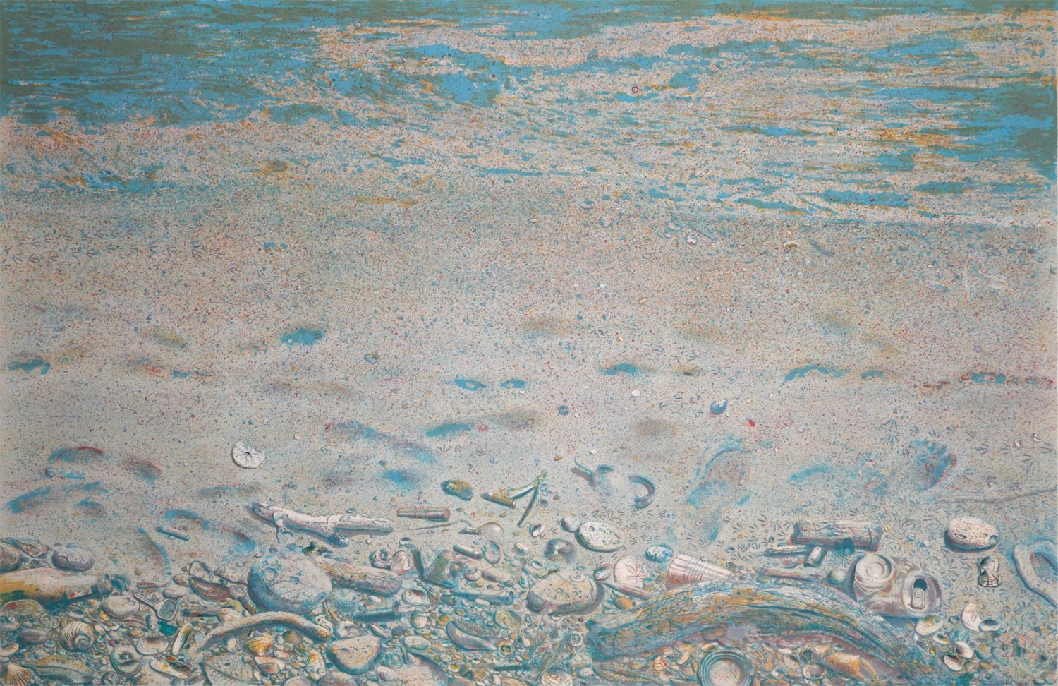 At first glance, the works of Asano and Katano fall into oppositional genres; Asano illustrates landscapes while Katano traces the movement of the human body through abstract forms. Yet, the works of both artists embody similar articulations of time. Asano’s fantastical depictions of oceans and beaches are indicative of movement. She captures the sensation of liquidity as a wave circles from ocean through rock, or the levity of a bird suspended mid-flight. These depictions of an imagined natural world are accompanied by traces of human activity. Footprints and debris litter the landscape, forming an additional layer of temporality that is both disruptive and symphonic to the landscape they inhabit.
