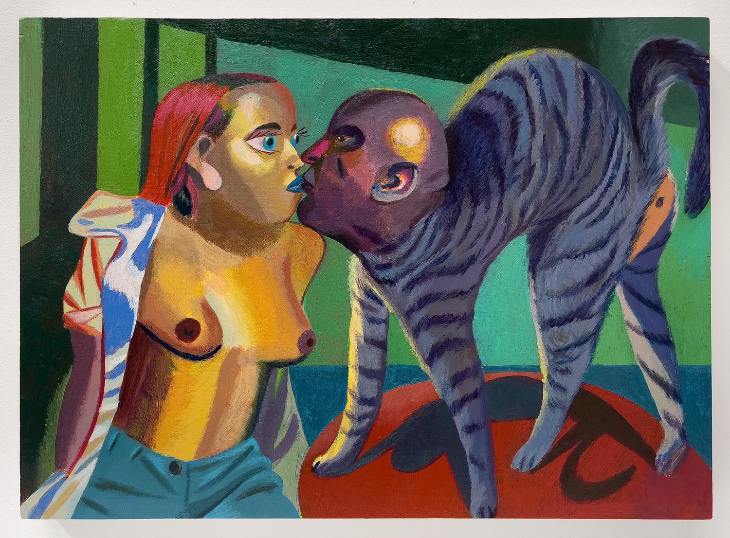 Morteza Khakshoor works with a range of subjects, but it’s his attention to the male––in all his foibles, struggles, and pathos––that remains a salient feature of his output. As frequent protagonists in his paintings, like all of his subjects, they result from circuitous paths through found images and memories, seen and remembered, or invented from whole cloth. His consumption of these images feed into his daily drawing practice, which in turn, metabolizes disparate information into schema for paintings at once playfully tragic and colorfully dark.