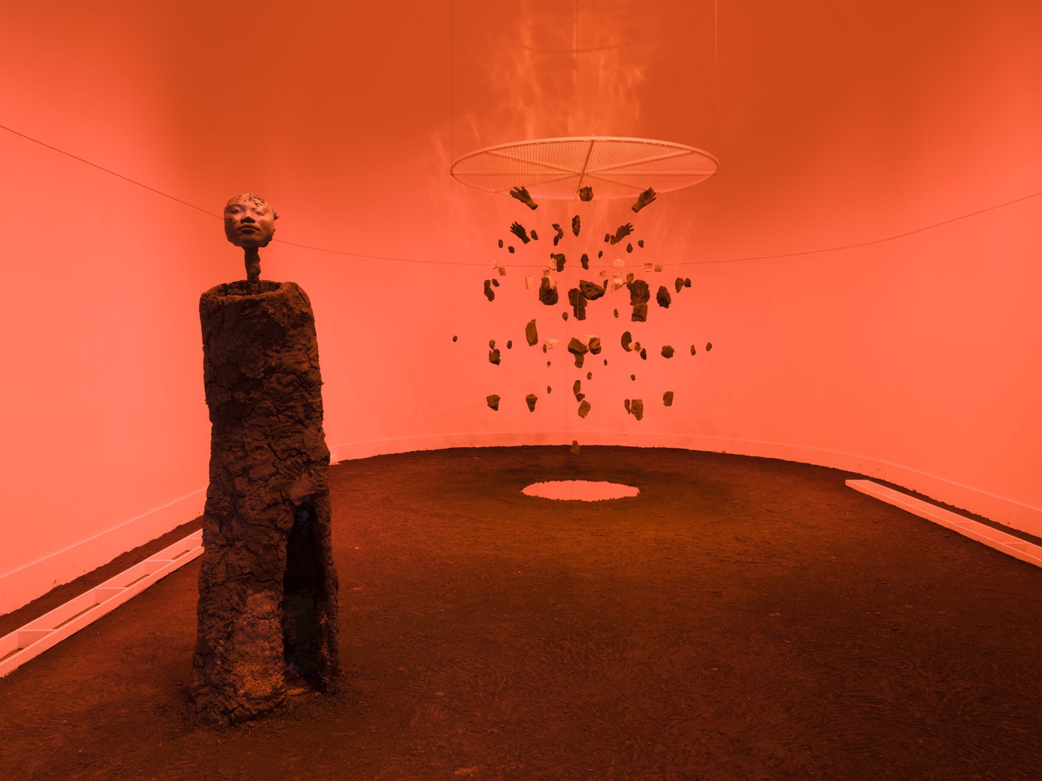 Between Starshine and Clay (2022) marks the first solo museum exhibition for artist Kiyan Williams (b. 1991, Newark, New Jersey) and is an installation that takes its name from an phrase in writer and educator Lucille Clifton’s 1993 poem "won’t you celebrate with me." Williams, who collects earth from familial sites and spaces that hold Black American histories, creates sculptural forms that slowly reveal traces and gestures of the body. Using dirt, sandstone, and other materials such as kanekalon hair, bricks, and wax to mold faces, limbs, and hands, Williams meditates on the notion of the “ruined” body and its potential to transcend and generate new genealogies.