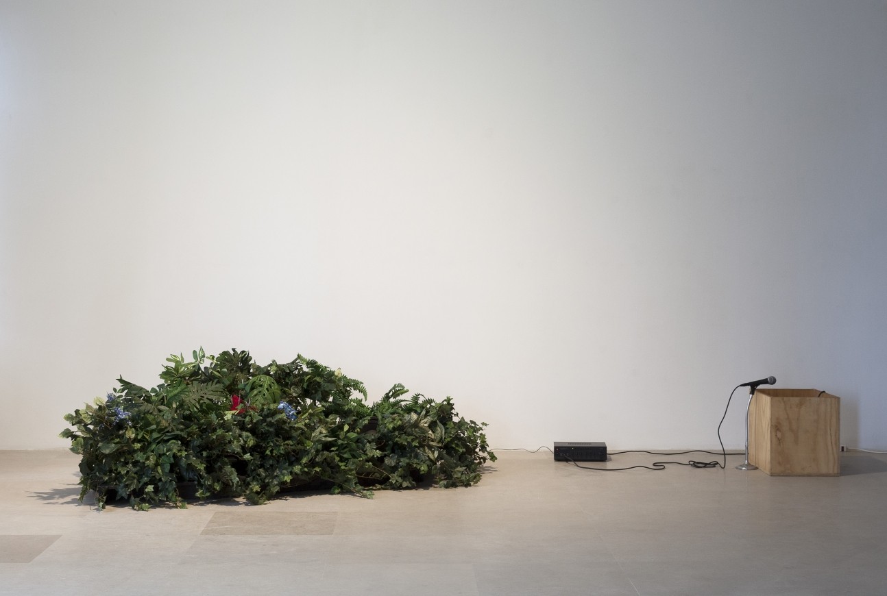 Garden Sound, 1970/2022, Artificial plants, plywood box, water, circulating pump, microphone, amplifier, speaker, 30 x 144 x 84 inches