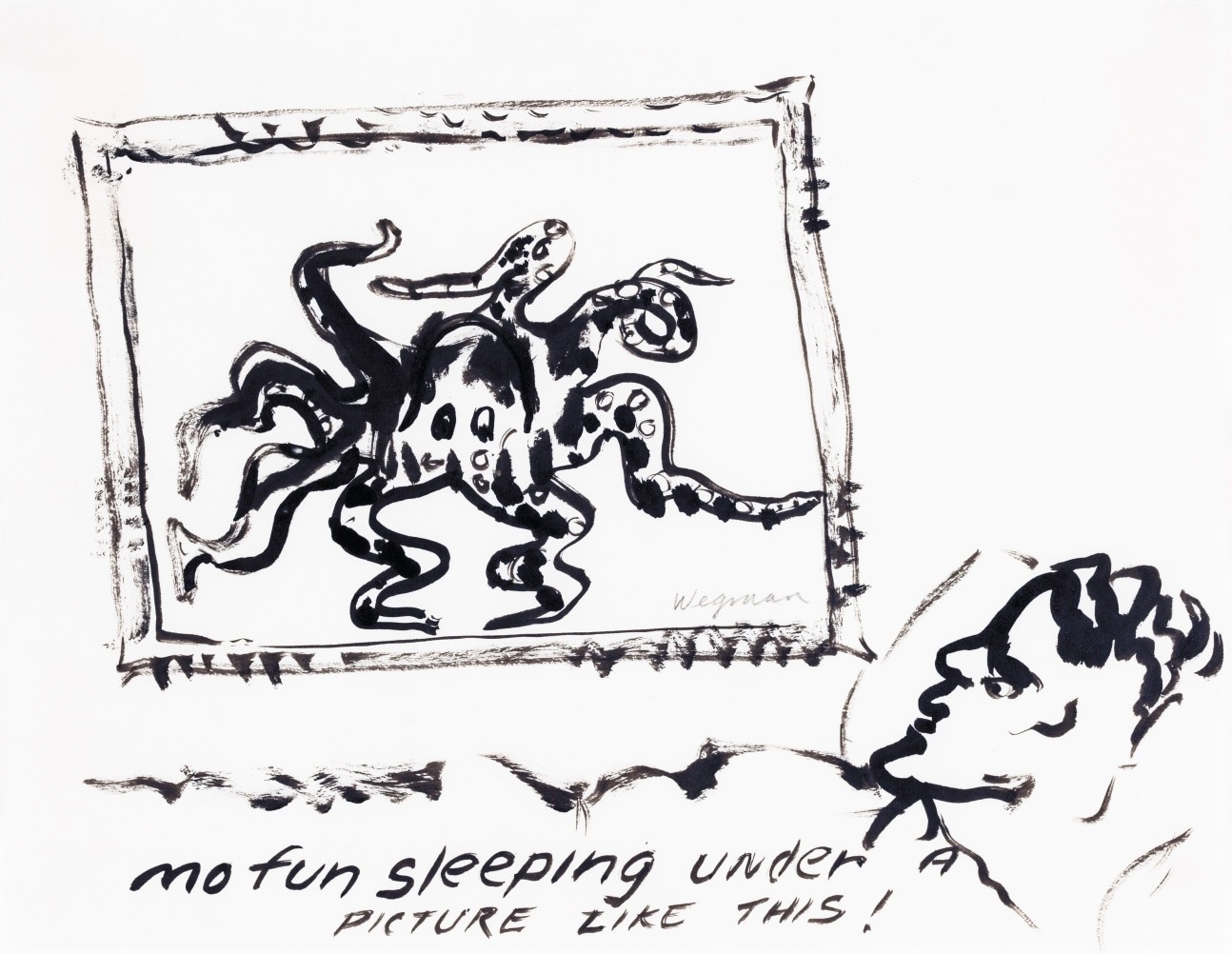 William Wegman: Art By Artist presents a concise overview of Wegman’s interdisciplinary practice with a special focus on his lifelong passion for art and music. Spanning five decades, the works collectively make visual and verbal art historic references that hearken back to the artist’s irreverent conceptual roots. Among the multitude of subjects are uproarious homages to a vast array of figures from Richard Serra and Josef Hoffman to Frank Sinatra and The Beatles. While the selected pieces bridge multiple eras and mediums, they readily demonstrate the consistent playfulness and signature humorous touch that permeates all of Wegman’s highly diverse output. The show spotlights the artist’s consistently comedic use of writing and language, most especially in his drawings. The title or the work often alters one’s read of the image, or sometimes the title appears within the work itself, acting as a caption or ironic commentary. Either way, Wegman constantly subverts viewer’s expectations by treating word and image as tools to undermine, surprise and induce laughter.