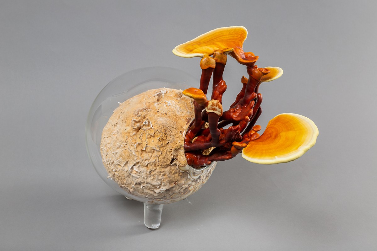 Drawn to objects that behave, react, change, grow, and carry rhythm, Shoemaker collects and propagates mushrooms sourced from wild urban growth in Los Angeles and myco culture libraries worldwide, supporting their fragile lifestyles in highly controlled environments of his design. Pairing Ganoderma lingzhi, or Reishi mushrooms, known for their medicinal qualities and red-varnish coloring, with hand-built ceramic vessels, blown glass, and plinths, Shoemaker develops a unique substrate formula that allows the mushrooms to grow for several months, slowly emerging from within each vessel into unique, dynamic forms. Comparable to a long exposure in photography, Shoemaker carefully moves LED lights, adjusts the temperature, changes the saturation of CO2, or moves the Reishi themselves closer or farther apart, carefully choreographing the forms.