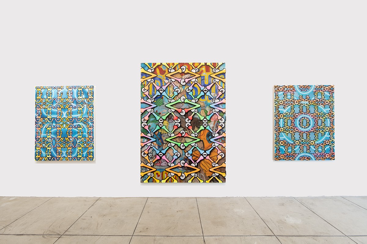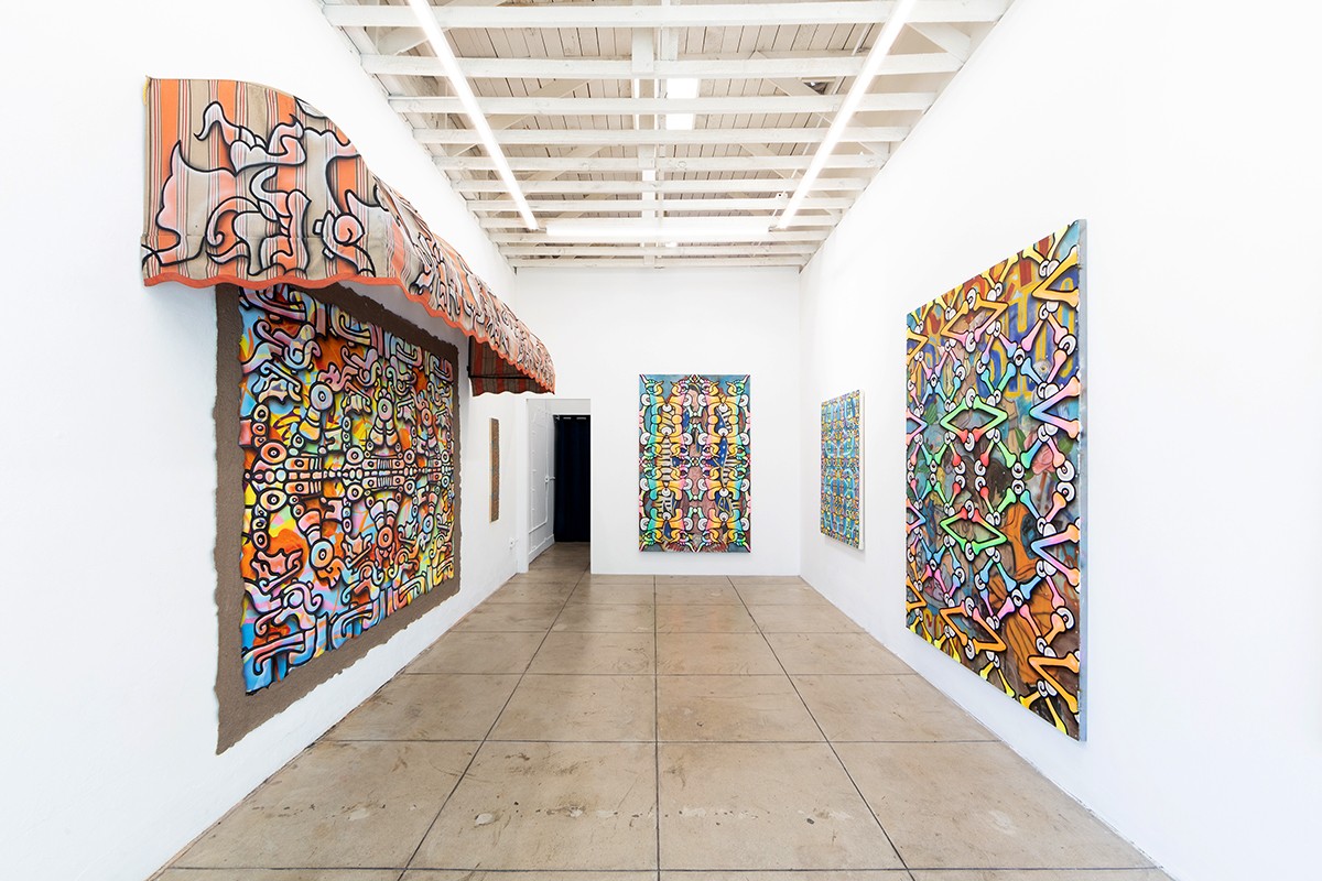 Blending generational histories, ancient folklore, unsanctioned public art, and pop culture, Ozzie Juarez uses visual language and cultural signifiers to examine notions of place and complex personal concepts of self. A former scenic painter specializing in physical simulation at Disneyland, Juarez entertained himself on the job by contemplating the colonial histories of American animation and by observing how shared experiences are constructed—the perfect parallel to Juarez’s ongoing research into surviving and destroyed Mexica (Aztec) culture. Juarez appropriates fragments from the four unadulterated Mexica codices—pre-Columbian paintings and texts on animal hide—and tessellates them into repeating patterns that resemble DNA sequences. This multiplication and extension of a language almost lost to colonization, is a spiritual act for Juarez that honors the Mexica people, culture, and deities while generating protective spells for any space that houses these art objects. Layering these patterns on top of neo-noir sunset gradients, homage paintings of contemporary street art, and unique wall texturing technique, Juarez creates portals into the past, present, and future.
