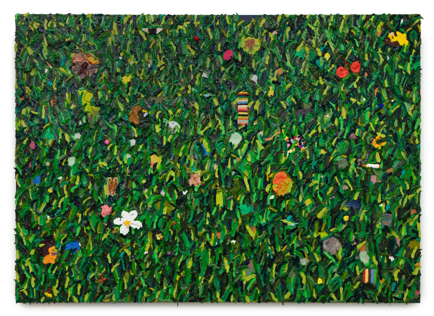 Drawing from an existentially observational sense of place and a playful approach to material, Beris’ self-described ‘grass paintings’ evoke finite fields of visual language and familiar objects. In each work, the artist recreates patches of a neighborhood park riddled with ephemera left behind from parties, playdates, and picnics. Squeezing paint directly from the tube onto the canvas, Beris builds each bulbous blade of grass to render a three-dimensional assortment of hidden objects, strategically placed and peering through the abstracted foliage. In searching for these Easter eggs the audience recontextualizes discarded objects with little perceived value and resurrects them as signifiers of a present place and time—satirical evidence that the artist actually leaves the studio.