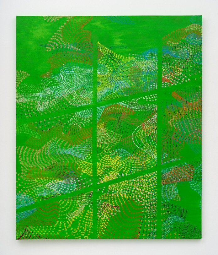 In Frequency Illusion, the unification of form and color within each artist’s practice reflects a surrounding world of inspiration. Gwen Hollingsworth’s attention to the only certain tonalities of blue suggests a profound preoccupation with unearthing the interior self from that of the exterior world. In the darkest shades, nearly inky black, she sculpts shape from shadow. Derived from a series of metaphysical paintings, they chart the passage of time, feminine intuition, and the artist’s own personal experiences, respectively. In contrast, Christine Turner’s colorful dotted paintings emphasize compositional structure. The expressive potential of the highly-pigmented greens and yellows, in contrast with accents of bright reds, accumulates each glance. Rhythmical and energetic, almost chaotic, they encourage regenerative acts without sentimentality.