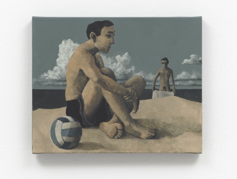 The use of the beach conveys a continuous experience of space through the implementation of a nearly-abstracted compositional arrangement, and explores relationships between artist, subject, and viewer. This significant motif is key to understanding Geerk's new work. Unlike the paintings in The Table Portraits (2018) and Mixed Blessings (2019), his first two solo shows with the gallery which emphasized sensuous curves and rippling forms, the works on view are notable for their strong architectural compositions.