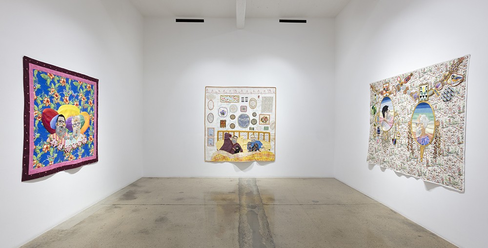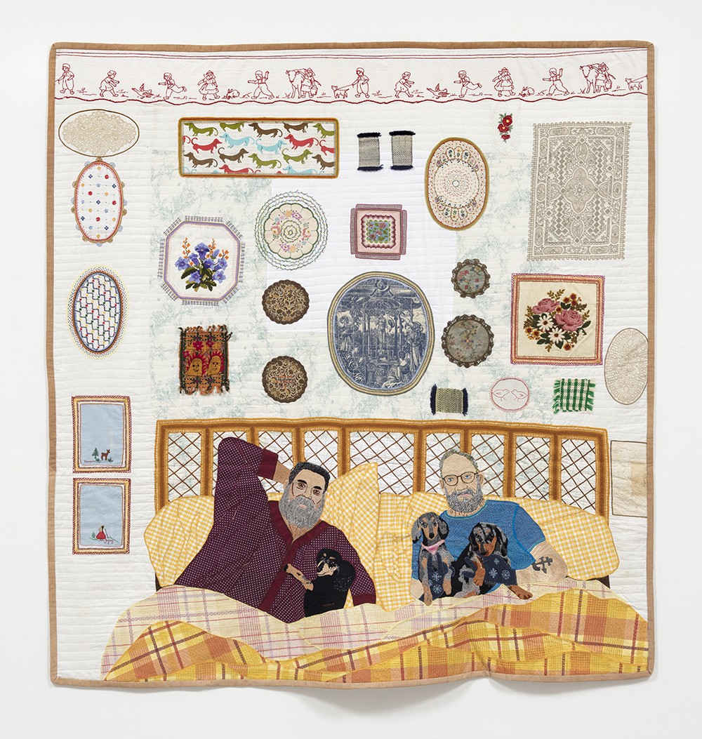 Steve Turner is pleased to present Paradise, an exhibition consisting of textile paintings by Chiachio & Giannone that depict the artists and their children (three dachshunds) within festive settings that convey a joyful celebration of life. The duo painstakingly embroidered their invented scenes on canvases revealing their extraordinary perseverance and irreverence in choosing to paint with unconventional materials. They reuse materials from older textiles which they acquire on their many travels. In doing so, old becomes new, and from routine, the artists have built their own paradise stitch by stitch.