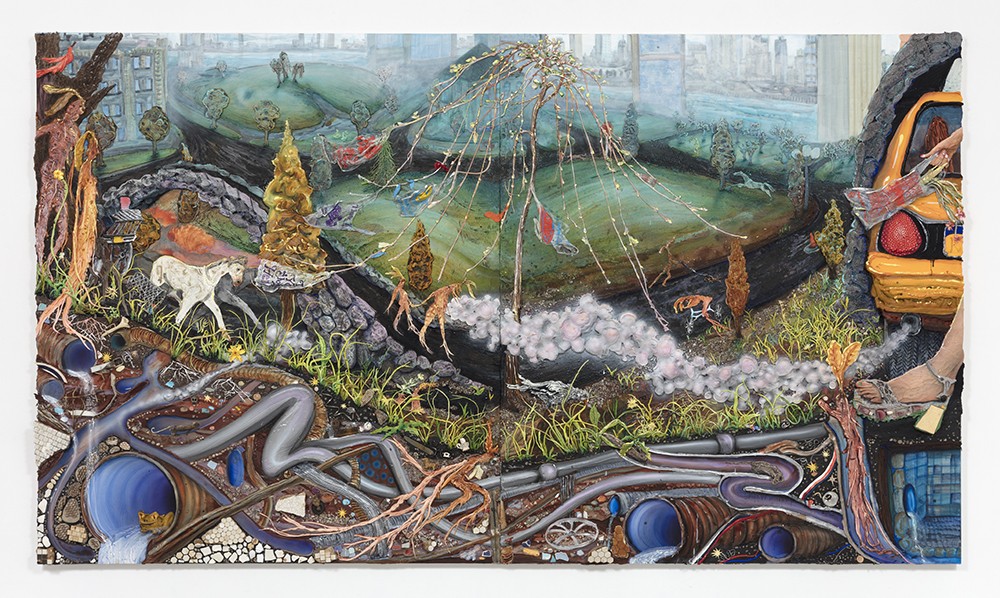 Steve Turner is pleased to present Unseen Animal, a solo exhibition of new paintings by Kate Klingbeil in which nature meets civilization, plants are human, and animals become machines. In this new body of work, Klingbeil’s root people, previously confined to life underground in past works, have now emerged from the soil, roaming through a world of horses, trains, cars, and smoke that is both familiar and fantastic. Landscape, cityscape, and dreamscape converge on canvases that combine painted passages with found objects including horse teeth, ceramic tiles, plastic toys, balloons, nail polish bottles, driftwood, toothbrushes, bird wings, rocks, and walnut shell, that Klingbeil foraged in New York and Milwaukee. The layering of these natural and man-made elements yields deeply textured, sculptural paintings that highlight the opposing forces of man and nature; trash and treasure as well as the seen and unseen.